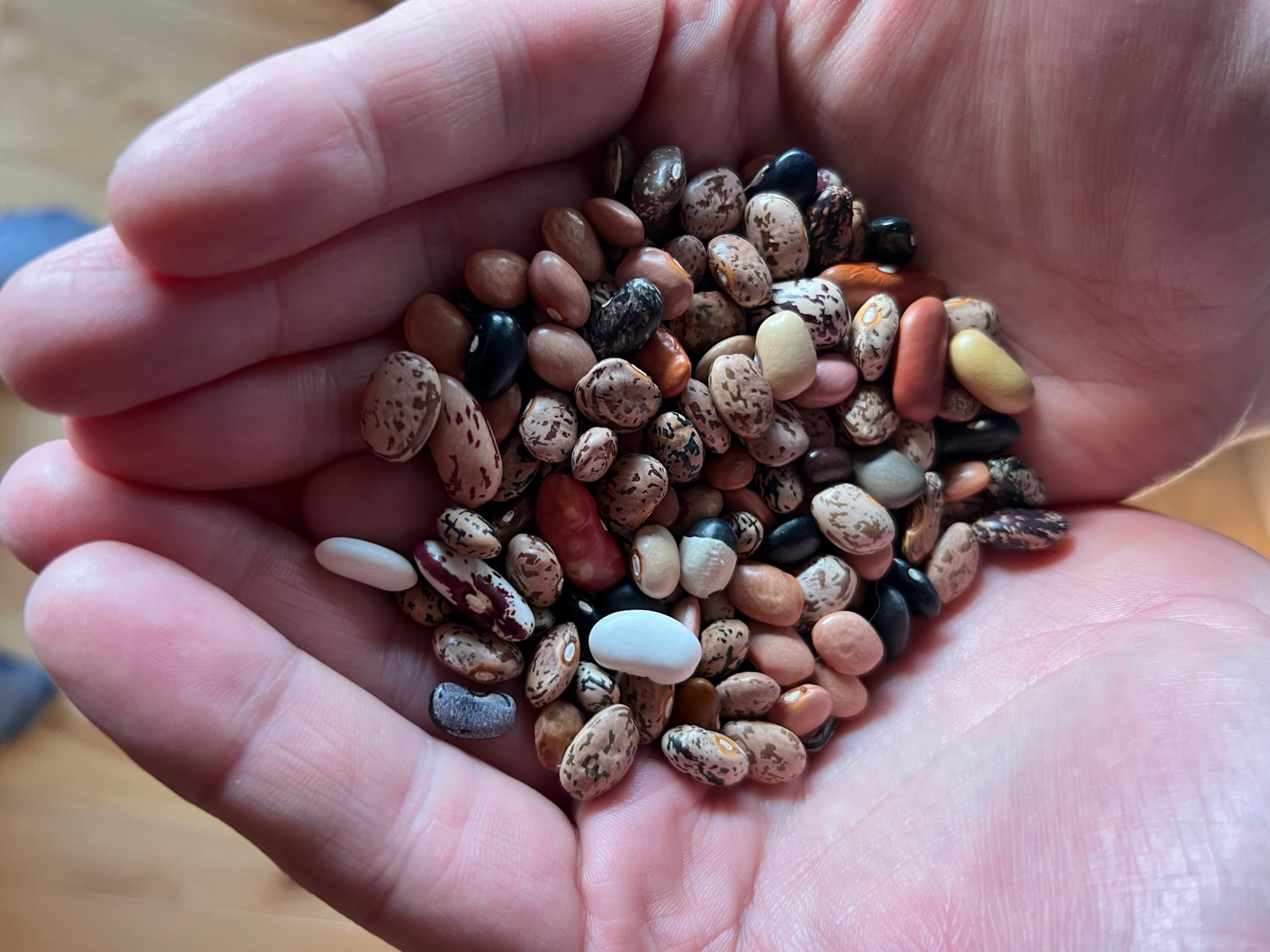 Maximum Diversity Beans - Several young landraces have been brought together along with many heirloom donations. The vast bulk of this mix is Phaseolus vulgaris, but I spotted cowpeas and tepary beans as well as a little sweet corn that I removed as I found it but there was enough that surely some slipped through.