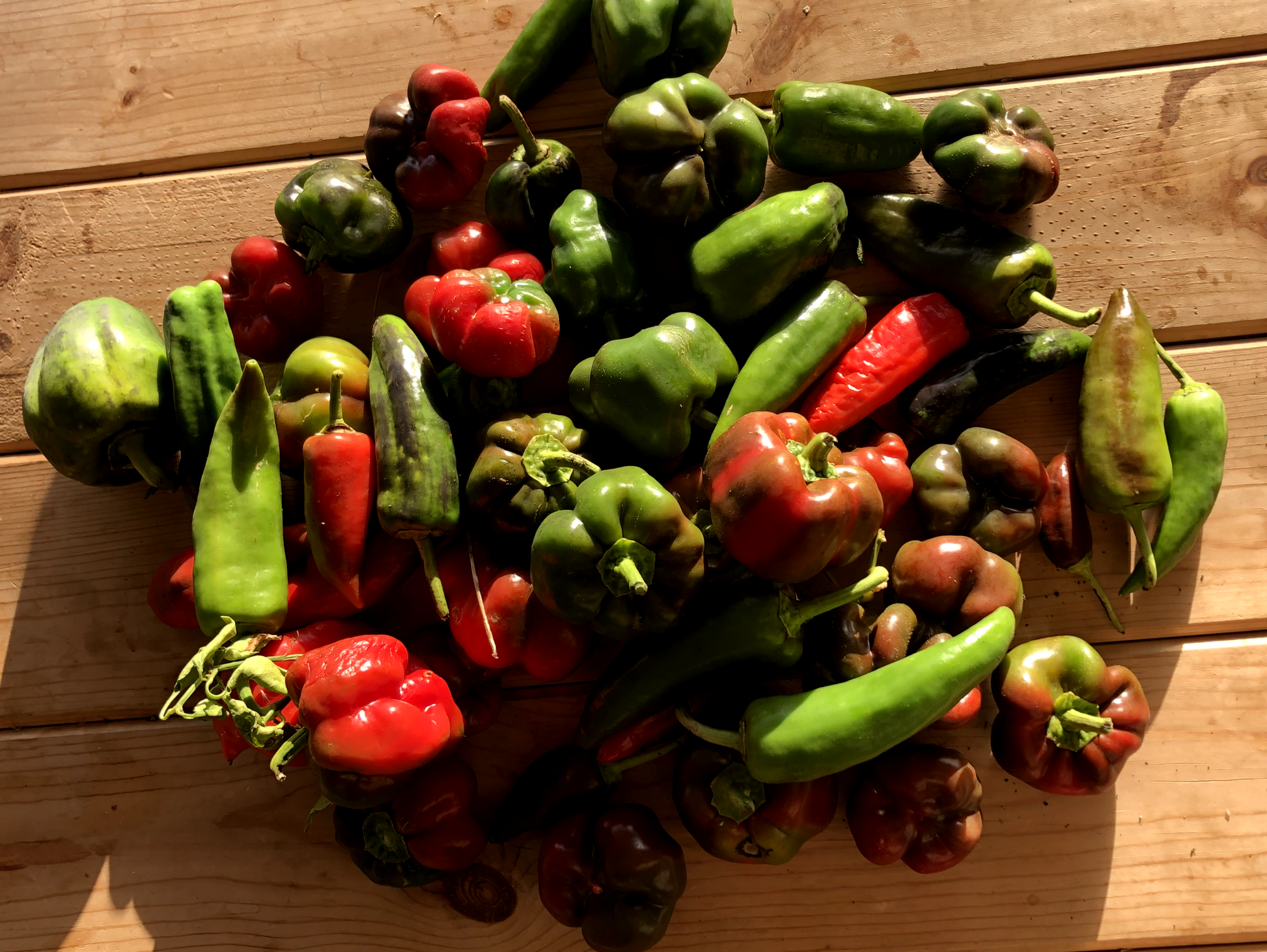 Peppers range from mild to super spicy. Includes jalapeno, poblano, and new mexico types, among others. Mostly capsicum annum with some Capsicum chinense and Capsicum baccatum.