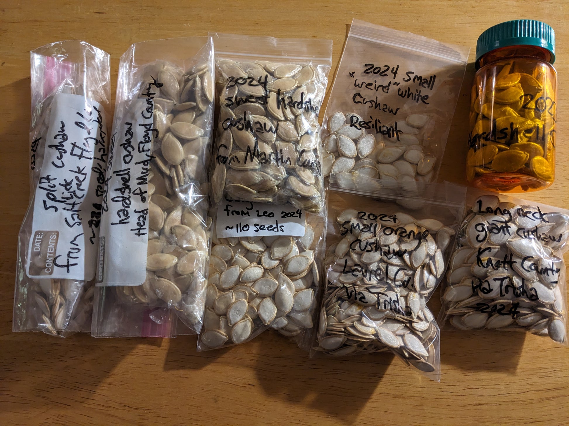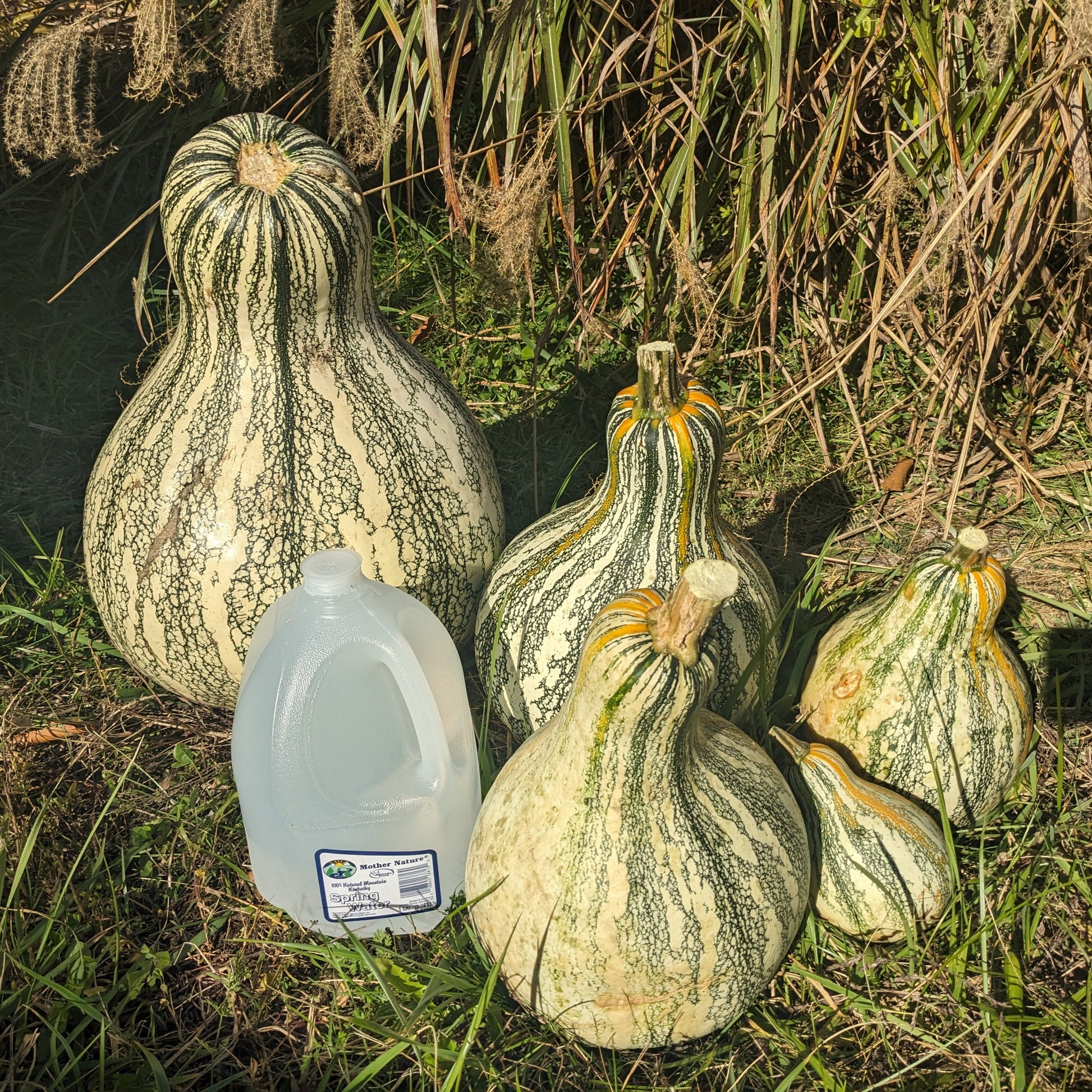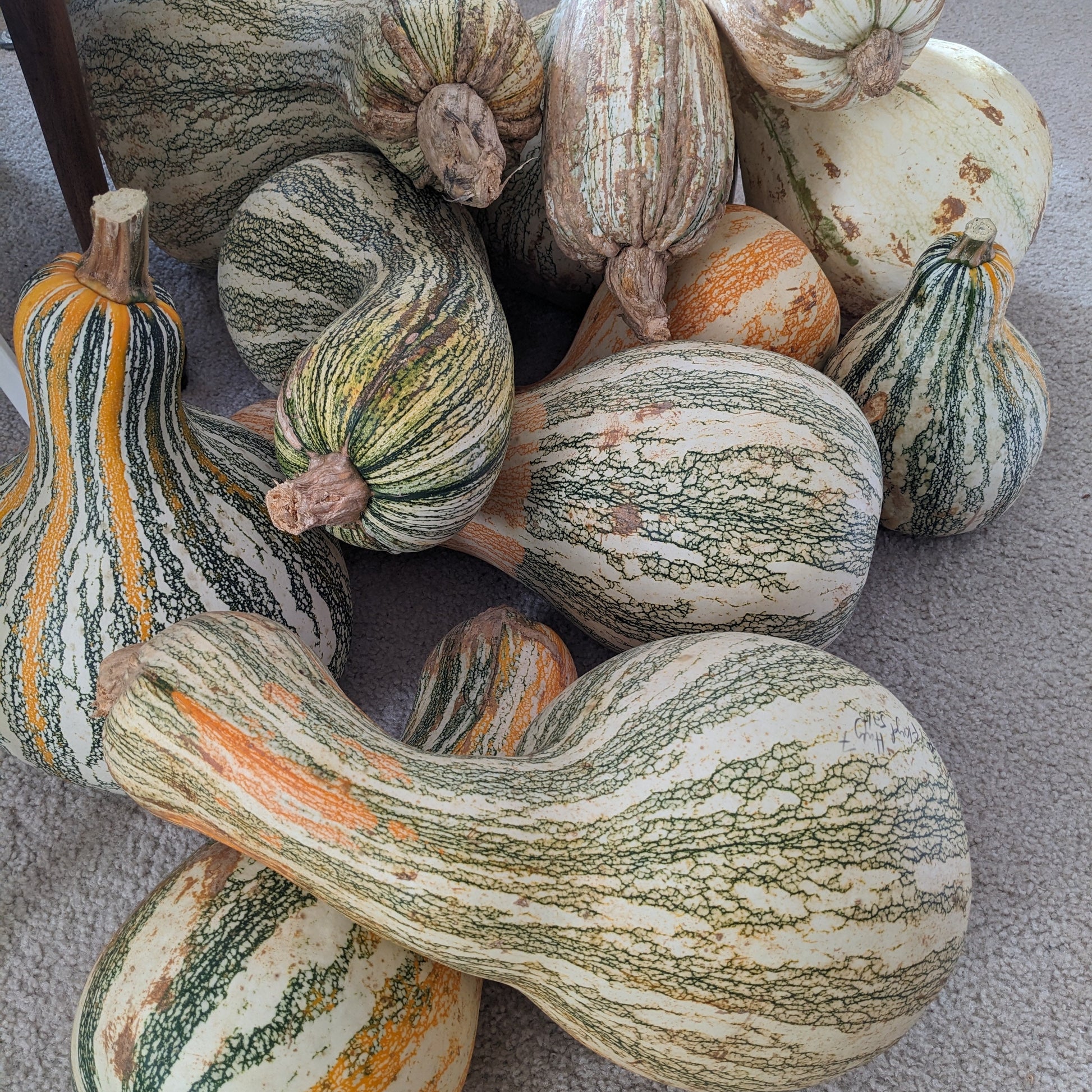 The 2025 Cushaw Squash seed mix has been contributed by growers of cushaw squash from the species Cucurbita argyrosperma, or cushaw squash that have at least some conspicuous C. argyrosperma characteristics. The mix does not include any cushaw varieties believed to be mostly or entirely Cucurbita moschata. Much of the 2025 offering was collected from small, independent farms in Eastern and Southern Kentucky that grow traditional long-storing winter squash cushaws with relatively sweet flesh. Most of these Kentucky varieties will not be available in future years unless grown out and returned to Going to Seed.