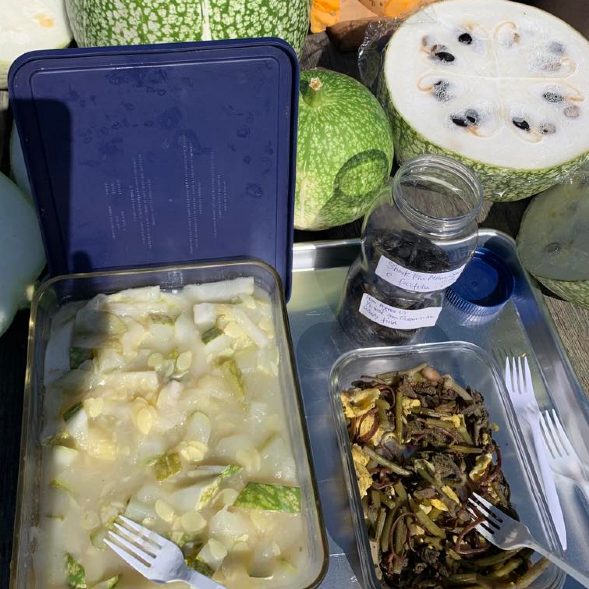 Fig Leaf Gourd (Cucurbita ficifolia), also known as Chilacoyte (Mexico), Alcoyota (South America), Shark Fin Melon (China), and Malabar Gourd (India) is native to Southern Mexico, where it is traditionally used to make candy. The plant produces fruits with edible black seeds, and the flesh is white with a mild flavor.