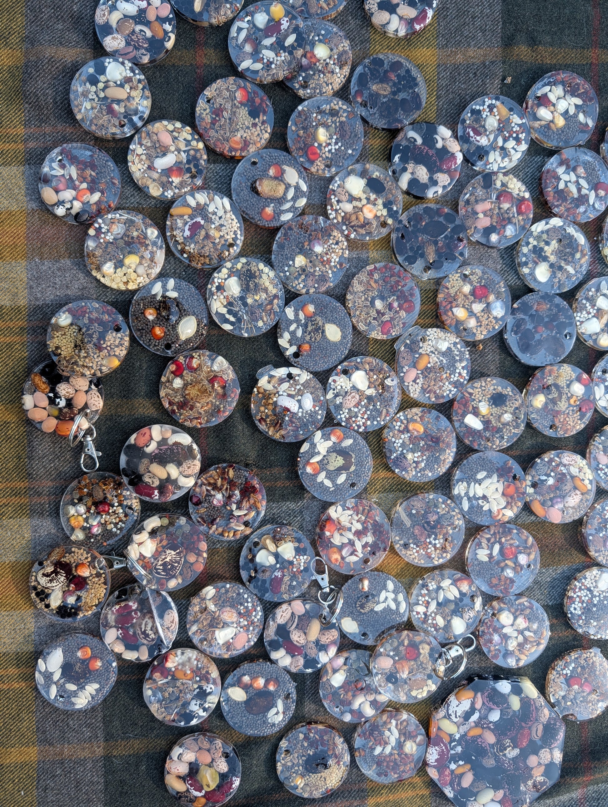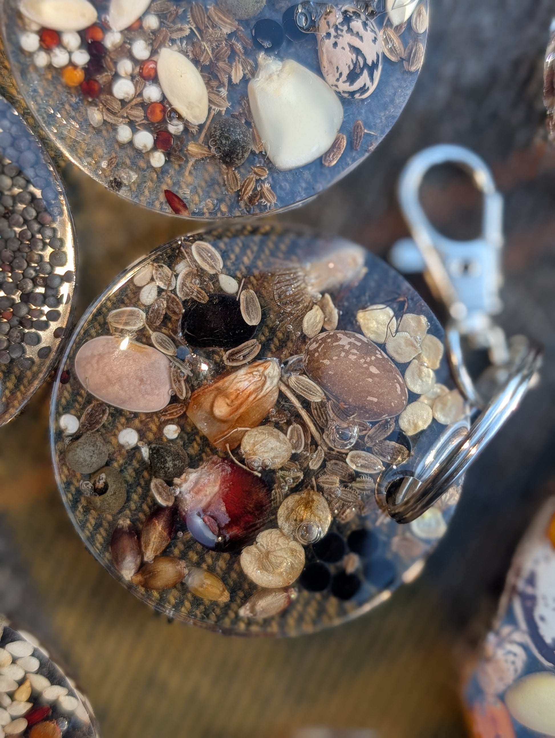 This 5-piece set includes 2 keychains and 3 magnets made from resin and seeds. These keychains are great added to anything with a zipper, like luggage tags.