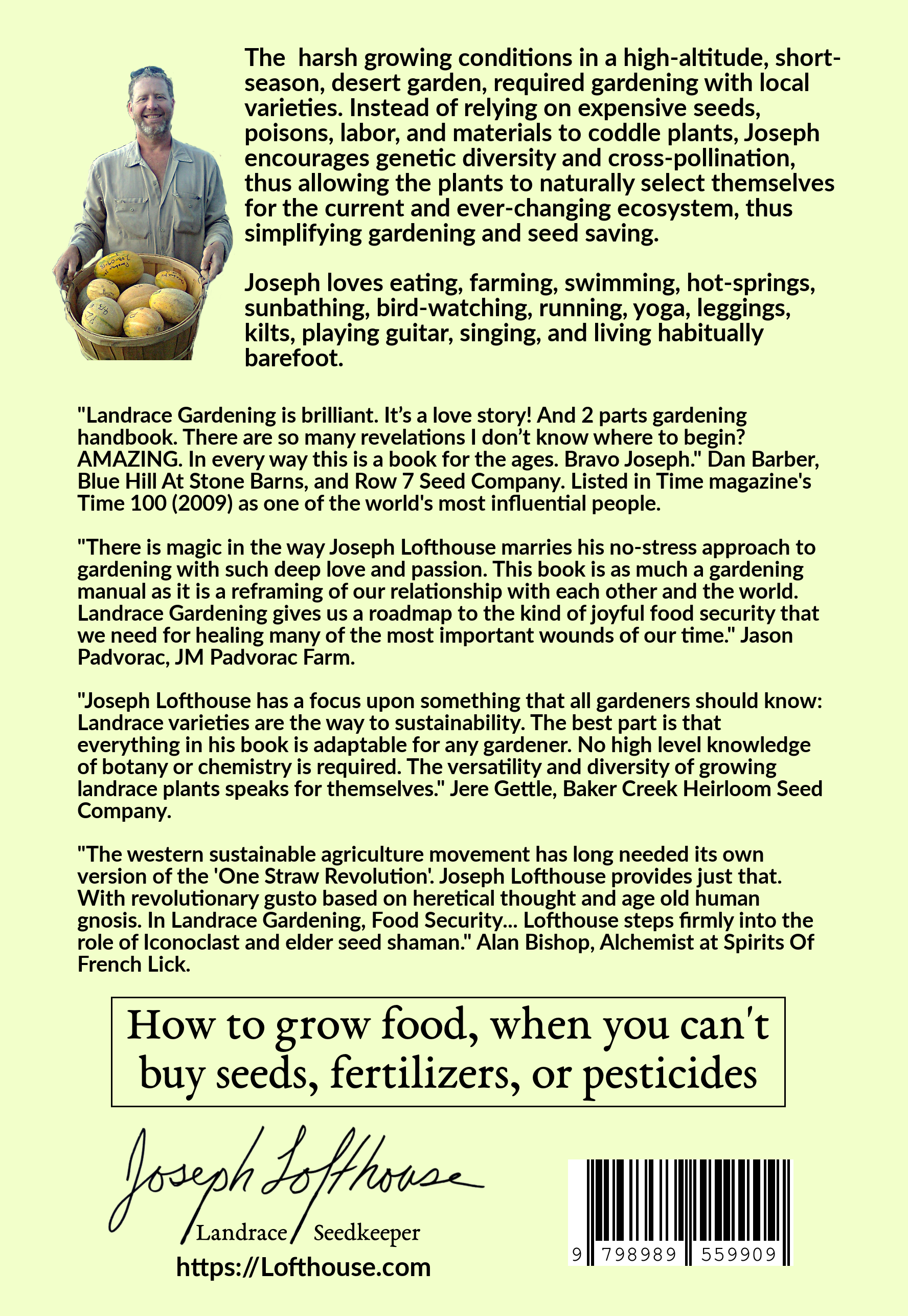 Landrace Gardening advocates a return to traditional regenerative horticulture methods of gardening and farming, while minimizing the use of current agricultural methods. Focusing on communities, and local varieties of crops and animals. Biodiversity and cross pollination allow selection for crops that thrive under ever changing conditions, while lessening the need for costly inputs, like poisons, fertilizer, materials, and labor. Less labor means more time for friends, family, music, dancing, or whatever it is that brings you joy.